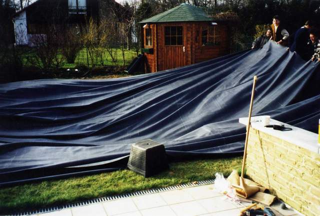 Le placement de la bâche à été réalisé le même jour, celle-ci a une superficie de 100 m². La cascade est intégrée à la bâche de telle sorte qu'il n'y a pas de risque de fuite à ce niveau. Attention lors du placement d'une bâche, veillez à exécuter cette tâche par un jour sans vent. La bâche utilisée est en EPDM.