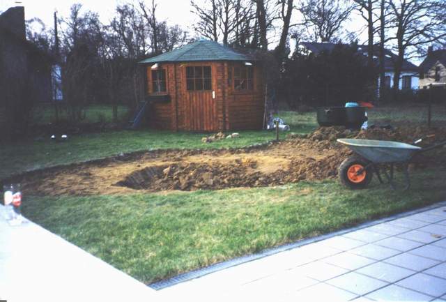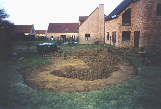 La forme à été définie sur place à l'aide d'un tuyau d'arrosage. Dans le fond de l'image on peut distinguer le filtre.