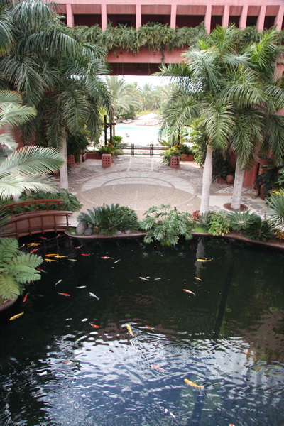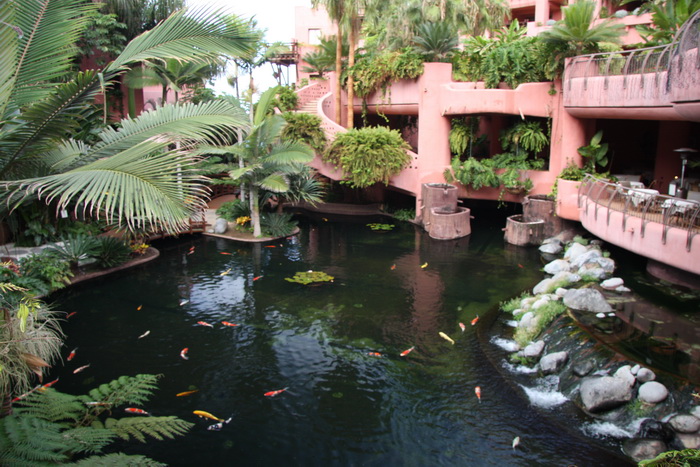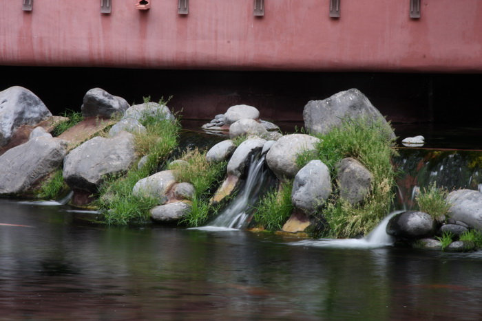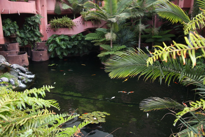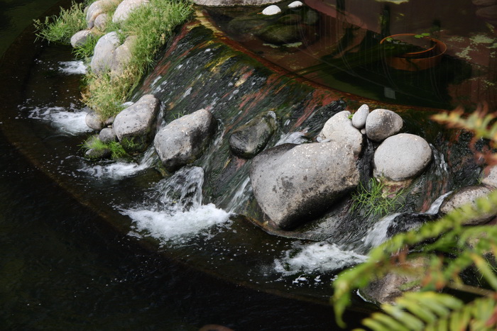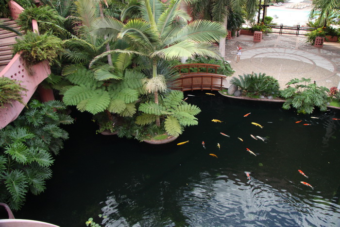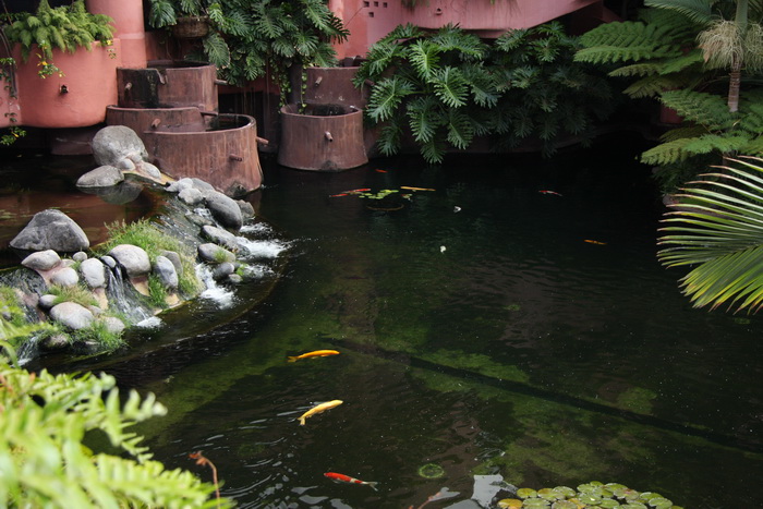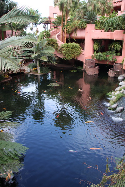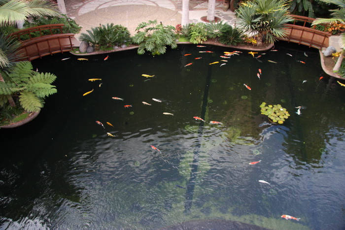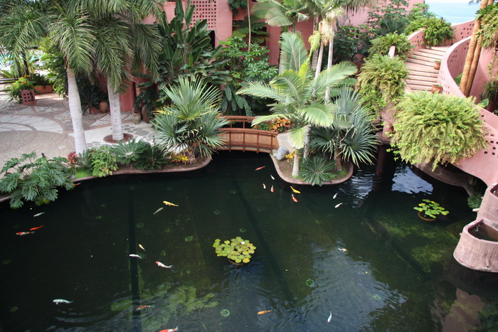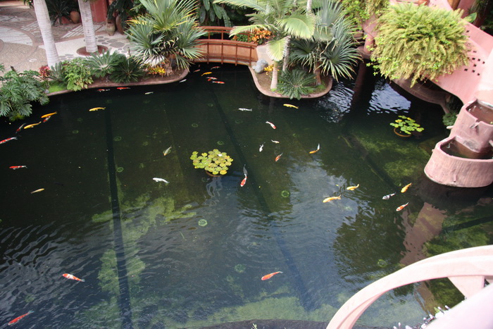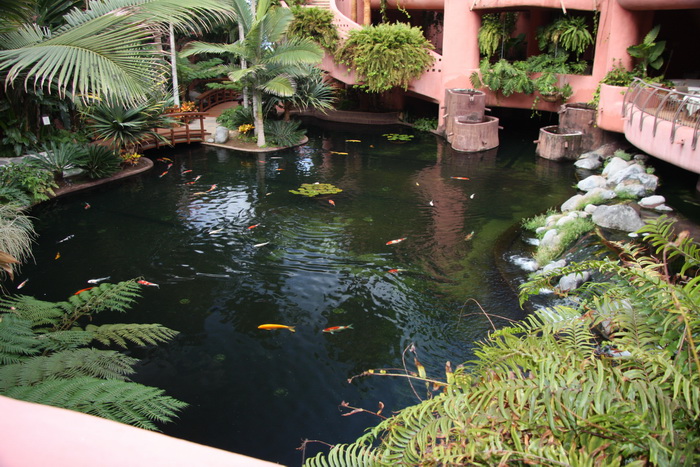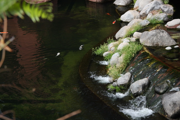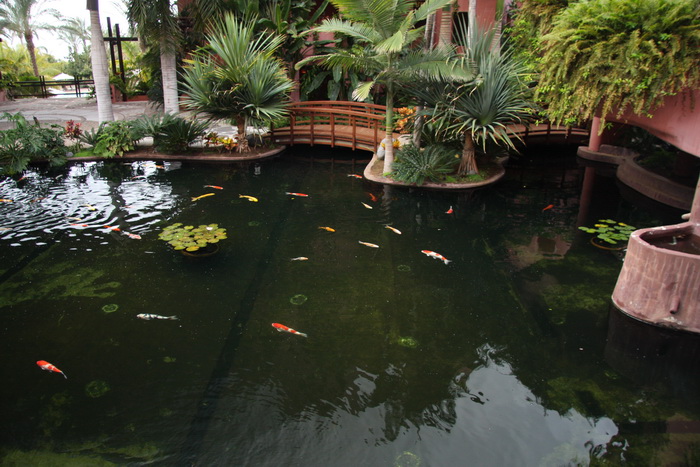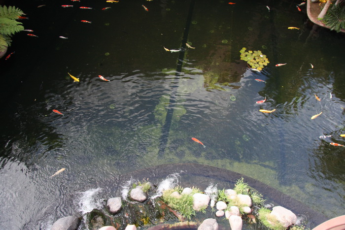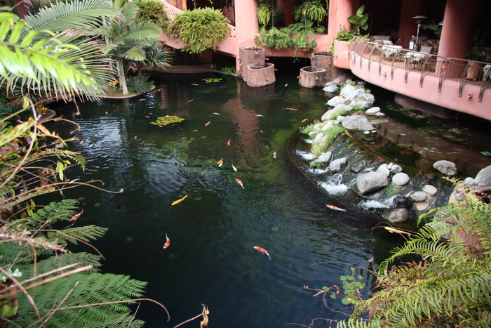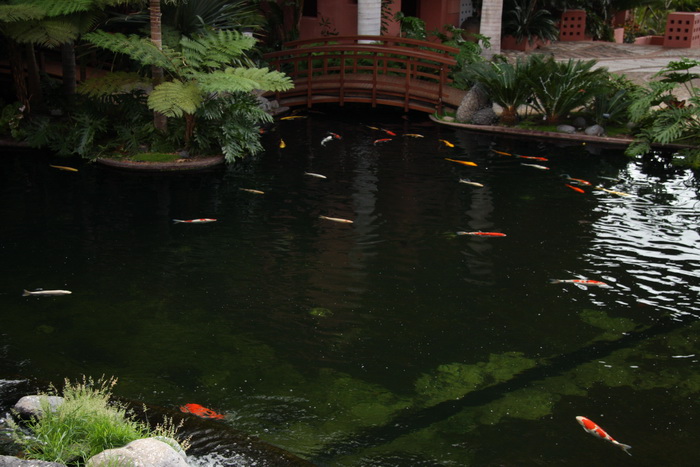 Passé la petite place, on arrive au-dessus d'un étang peuplé de koïs, les