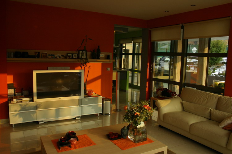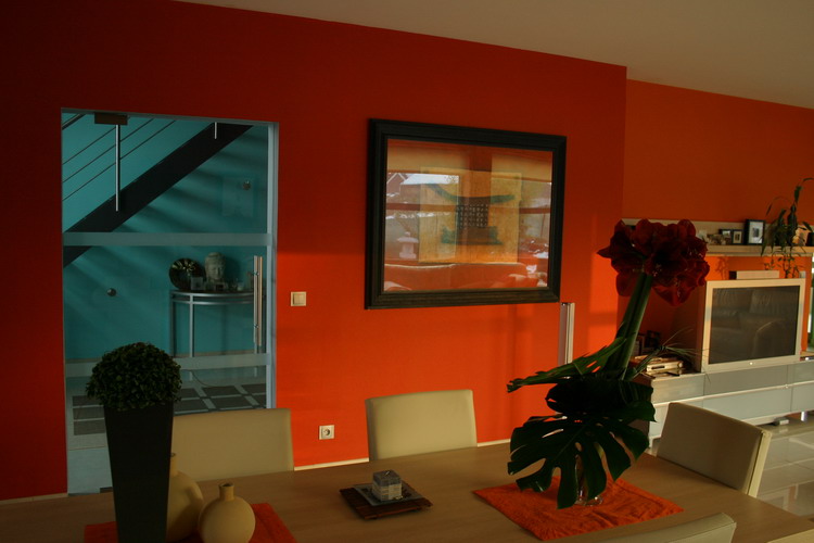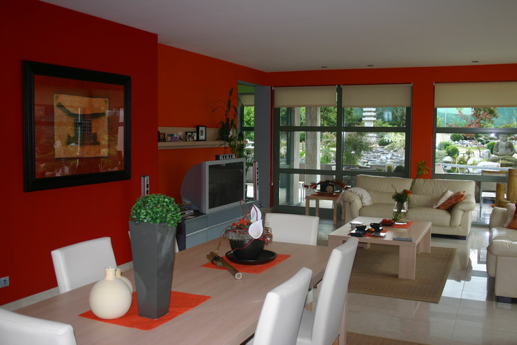 Le living est spacieux et peint tout en rouge vif, c'est vraiment pas courant cette couleur chez nous et le rendu est tout simplement superbe