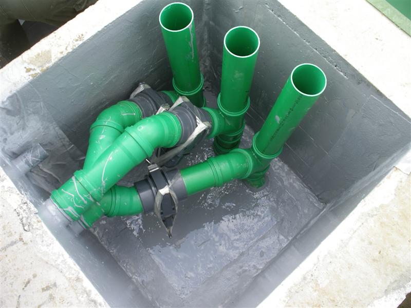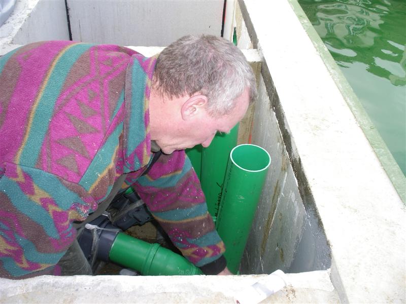 arrivent les tuyaux qui emmène l'eau en gravitaire au filtre, et celle au