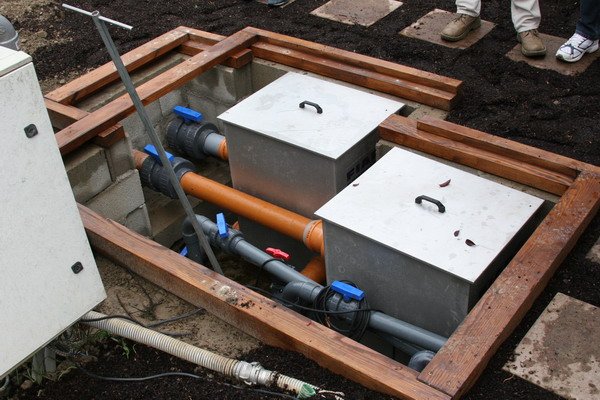 filtration du bassin avec un double filtre à grille en inox et un filtre