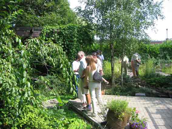 spécimens de Koïs situés à l'étage dans des bassins, et un petit jardin aquatique