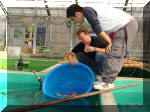 Ce sont principalement les splendides sansais (trisannuels) doitsu gosanké qui se font remarquer! Ils viennent d’être récoltés et nous sommes donc les premiers à pouvoir choisir. Après deux heures d’examen à l’épuisette et de pourparlers, on est tombé d’accord pour une sélection de 12 ravissants sansais. Il s’agit de doitsu sanké, de doitsu kohaku et de doitsu showa, tels que nous les préférons.