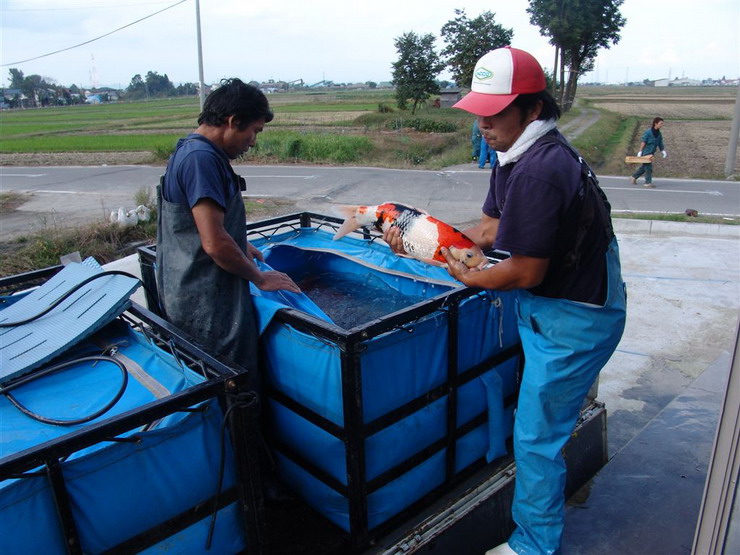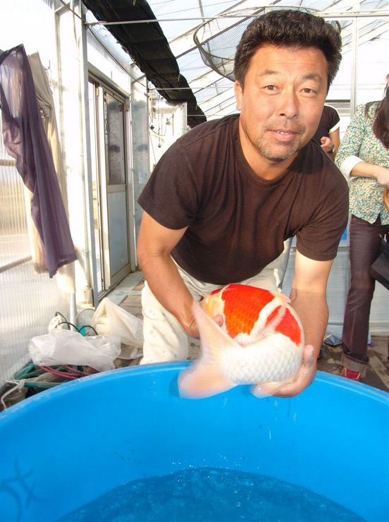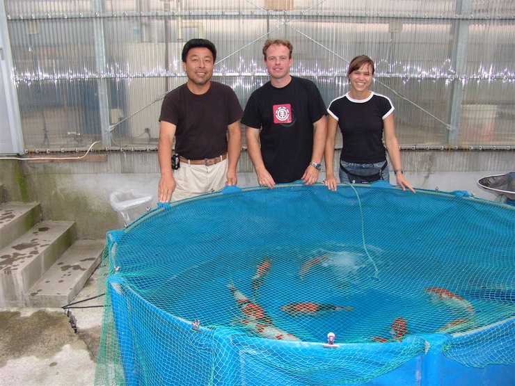 Depuis le tremblement de terre, celui-ci emmagasine la plus grande partie de ses koi dans un énorme hangar, ce qui donne une vue pas très réconfortante, mais il faut qu’il puisse tout de même les loger quelque part. Il y nage une masse de koi jumbo, mais les bonnes surprises sont rares. Nous avons la nette impression que ce sont, chaque année, les mêmes koi.