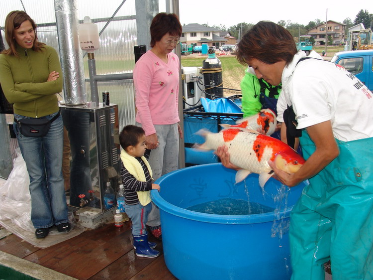 Les frères Yagenji de la Isihara-koifarm ont récoltés entre-temps leurs grands koï, qui ne sont pas logés, comme de coutume, dans la grande maison des koï qui a subi de gros dégâts, mais bien à l’extérieur dans un grand bac, en attendant que la nouvelle maison des koï dans la vallée soit achevée.