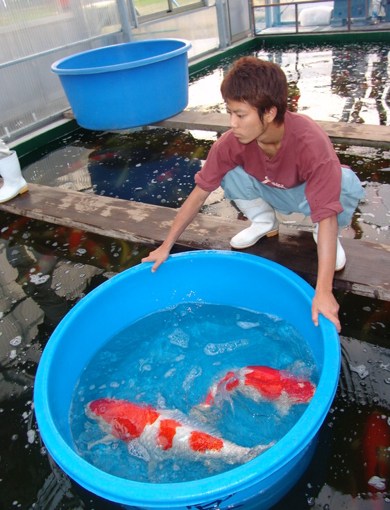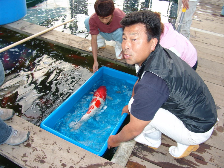 Comme la fois passée, la chance nous sourit : ils viennent d’arriver avec un nouveau chargement de koï fraîchement récoltés, composé de yonsais (4 ans) et gosais (koï de 5 ans), quasiment tous des gosankés (kohaku, sanké , showa). Je peux vous assurez qu’un vrai amateur de koi ne sait plus à quoi s’en tenir lorsqu’il est mis en présence d’animaux, ayant tous des dimensions de 70 à 80 cm, tout en se réalisant que le prix de ces koï peuvent faire mal.