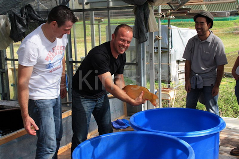 Notre sélection: 2 nisai ginrin beni goi , 2 nisai shiro utsuri et 1 nisai kohaku, tous à la taille d’environ 40 cm. Dans le bassin de haute qualité nous sommes attirés par les beaux koi et arrivons à cette sélection : 1 gin rin sandan kohaku, 1 gin rin nidan kohaku, 1 nidan kohaku, 1 showa au sumi splendide, 1 kohaku et 1 doitsu kohaku.