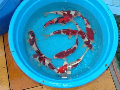 Les salutations sont cordiales et je peux sélectionner 3 beaux kois, un doitsu kujaku, un maruten kohaku que je voulais à tout prix depuis une semaine et –comme bouquet- un splendide doitsu kohaku qui serait certainement la star à n'importe quel koishow ! Le frère aîné me dit en souriant : “Kim-san is very good customer!”