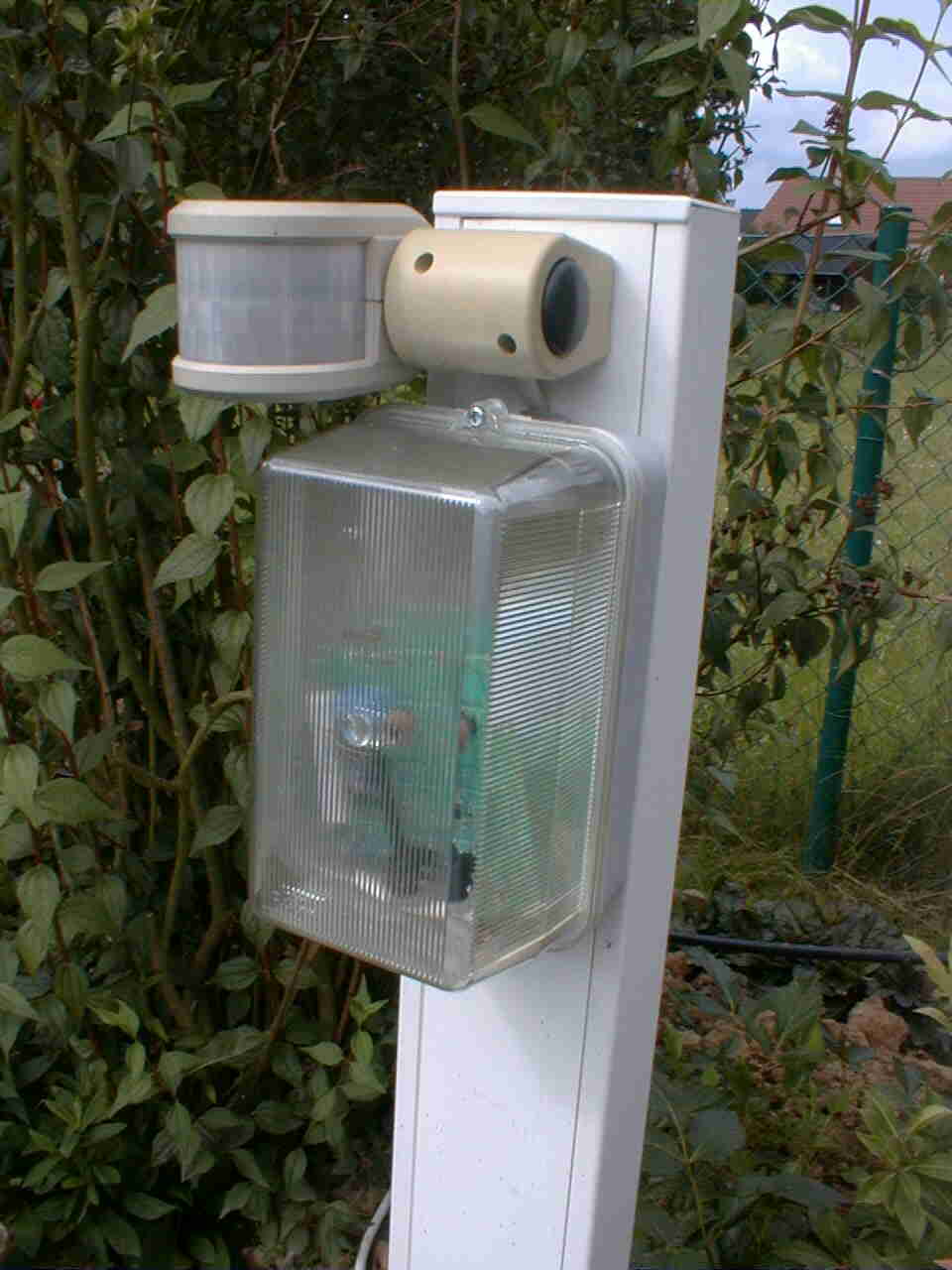 Un petit stroboscope en kit à l'intérieur de la lampe tempête. Un détecteur de mouvement pour extérieur constitue la partie active du