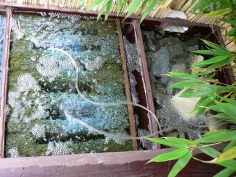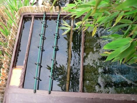 - 2° L'entrée horizontale de l'eau donnait trop de remous et l'eau passait au dessus de la parois Upflow, d'ou le petit déflecteur en PVC orange visible sur le détail de la première chambre.