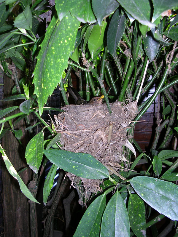 | La merlette qui a décidé de prendre mon composteur comme fournisseur de matière première pour nid et ma sortie de pompe pour la salle de bain... |
