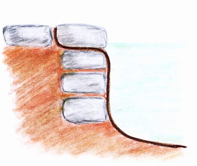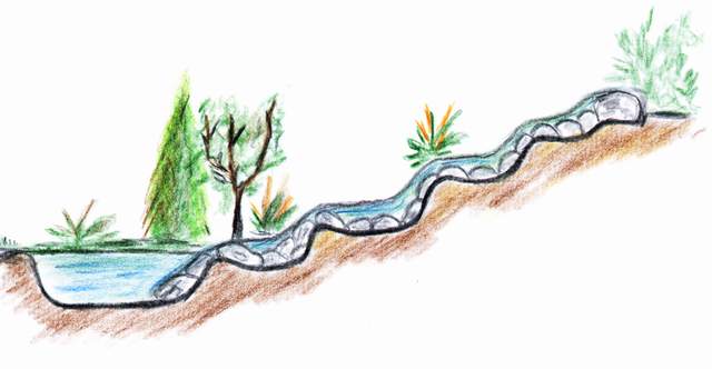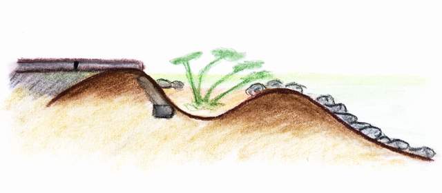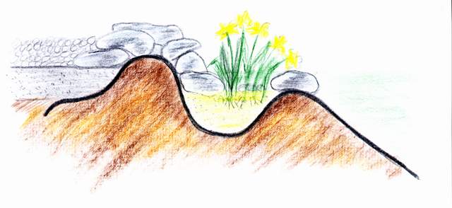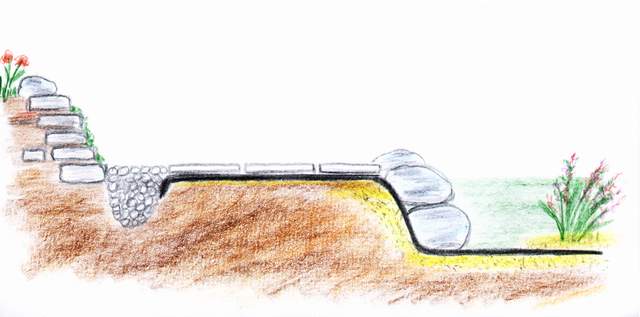 passage en plaques et jardin alpin. Vous remarquerez la zone de drainage