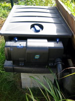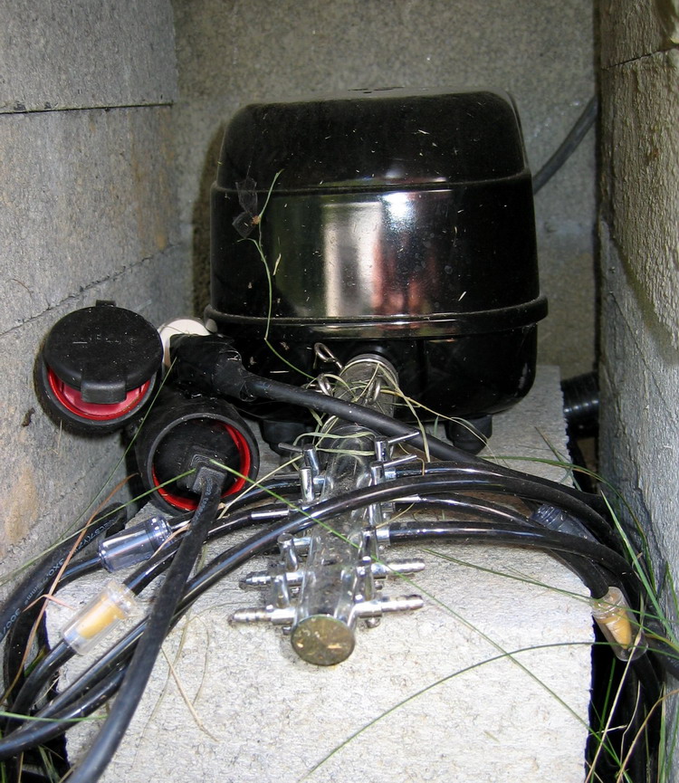 La POMPE A AIR, une messner 1680 l/h. Planquée sous le filtre pour être à l'abri de la pluie. J'utilise