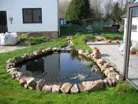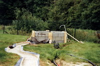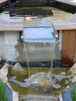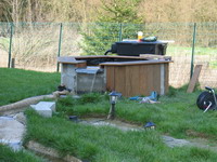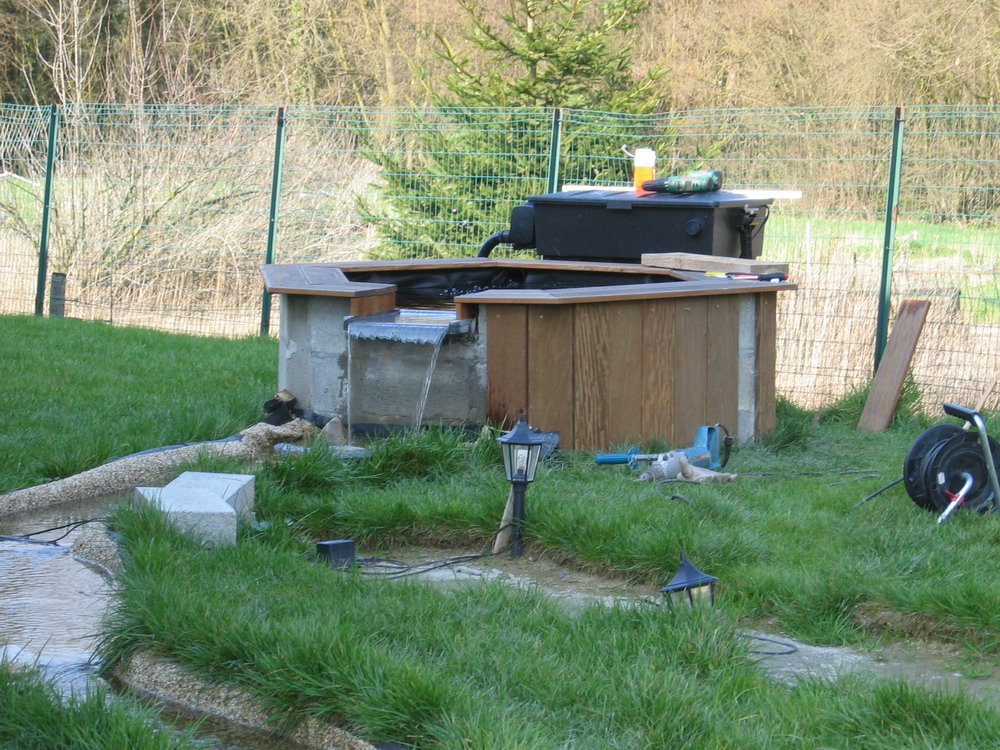 pris sa place définitive derrière le petit bassin ... et le circuit est mis en test, l'eau arrive du grand bassin dans le