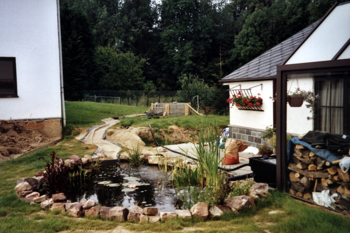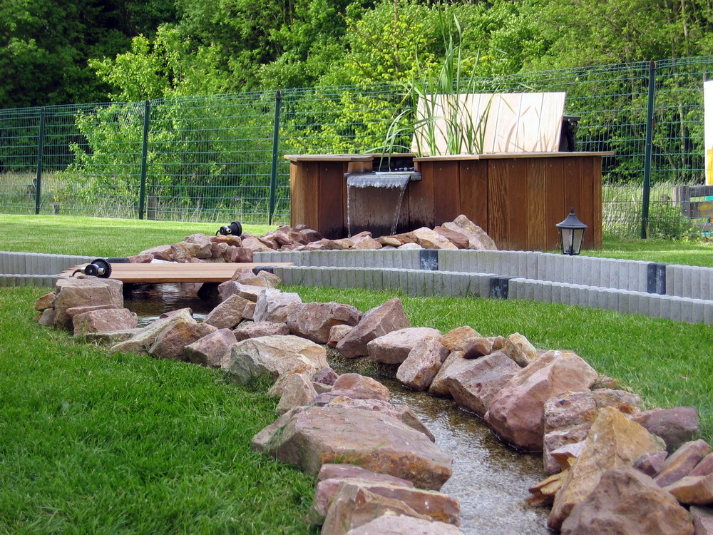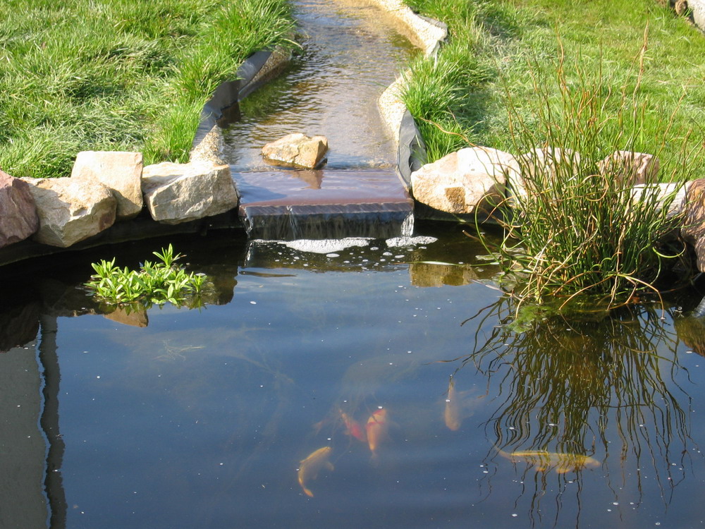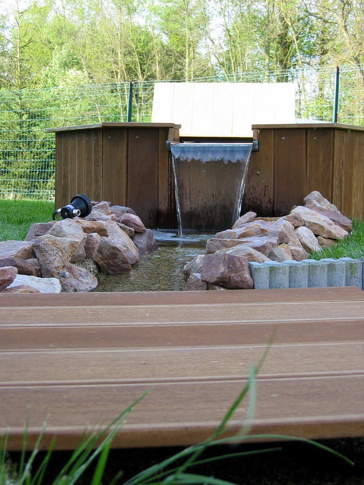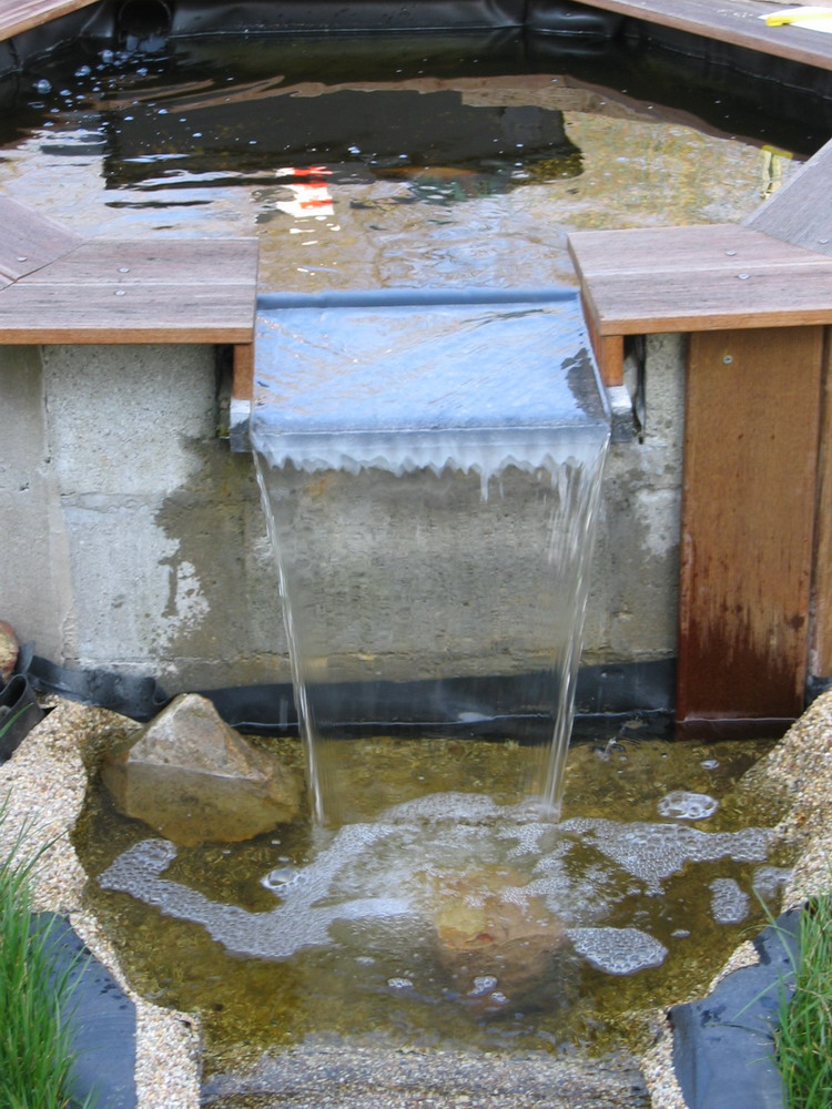 filtre, qui se déverse dans le petit bassin, qui à son tour se déverse dans le ruisseau par la lame d'eau, et le ruisseau