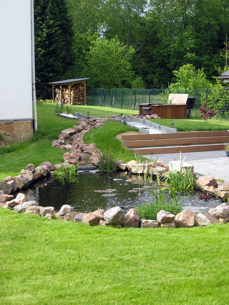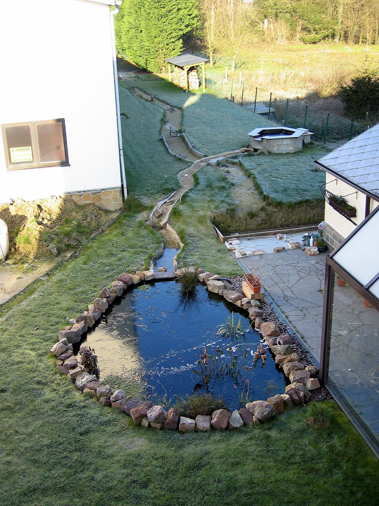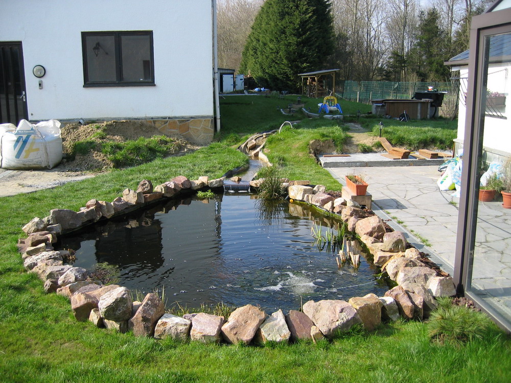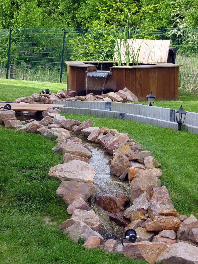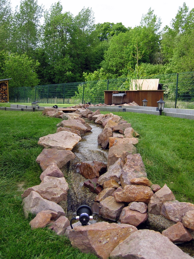 filtre, qui se déverse dans le petit bassin, qui à son tour se déverse dans le ruisseau par la lame d'eau, et le ruisseau
