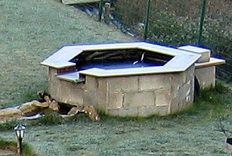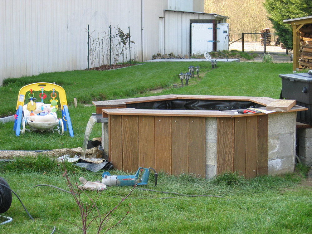 Dernière étape avant la trève hivernale (bien que la photo a été prise pendant l'hiver), habillage de la partie supérieure du petit bassin avec des planches d'ipé.