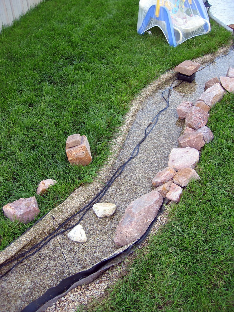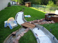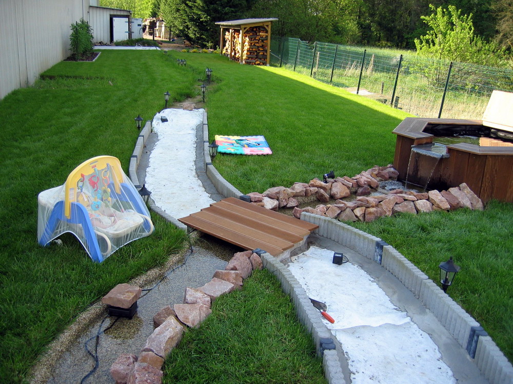pour planquer transfo et cables des lampes le long du ruisseau. Un petit pont est aussi installé au dessus de l'eau et les bordures