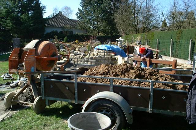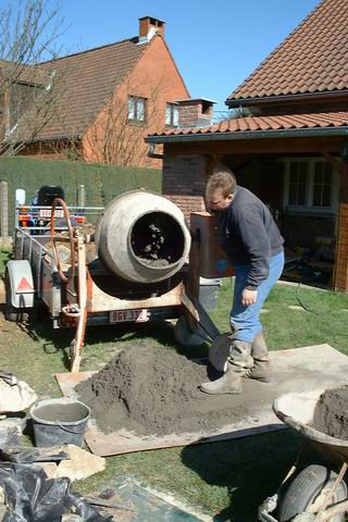 Michael est bien équipé, il prépare le stabilisé à l'aide de sa bétonneuse