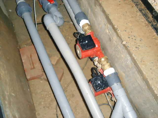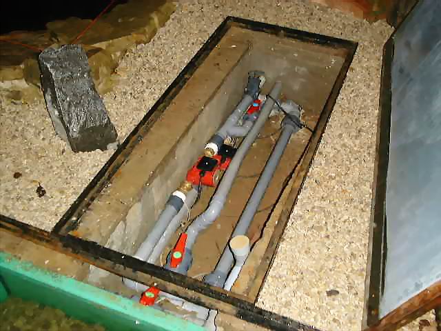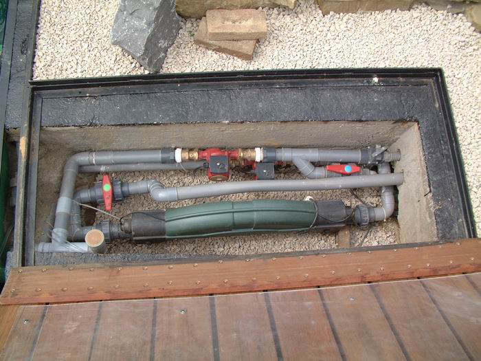 | La fosse technique pour les deux circulateurs en inox. Elle est en communication ave la fosse de rejet vers les égouts, ceci