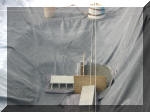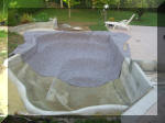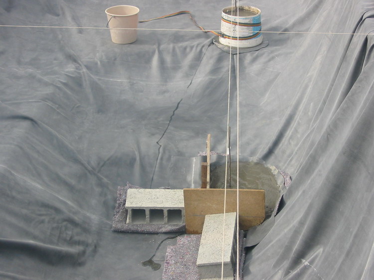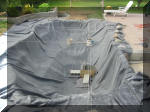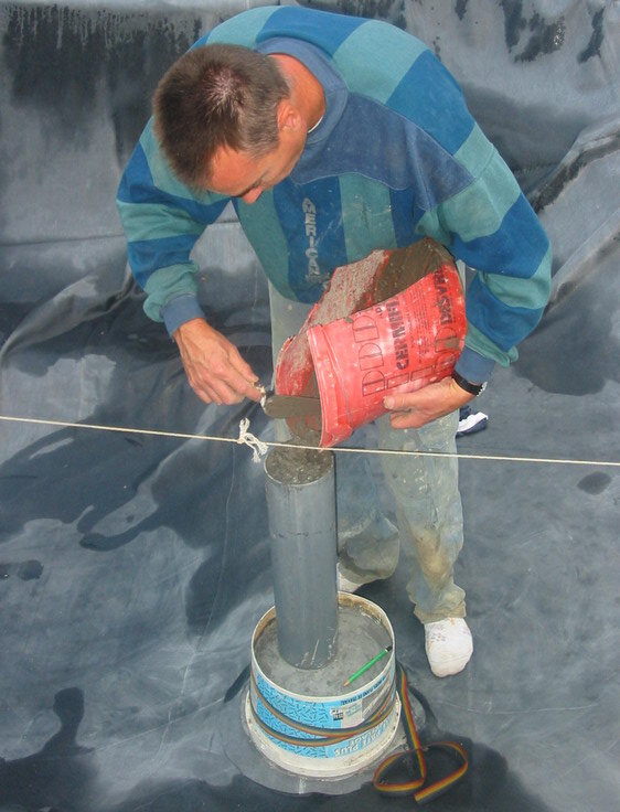 (restes de bâche plus feutre) ; coulage de piliers dans des tubes en PVC de