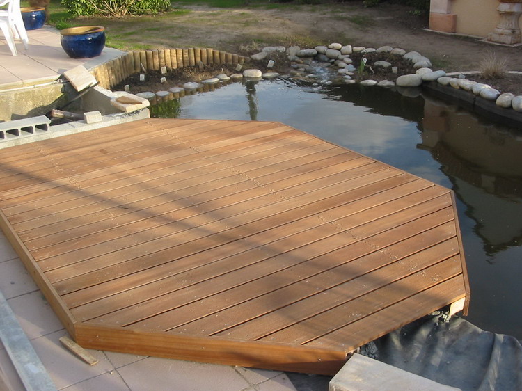 Le platelage est réalisé avec des lames en Bankirail de 12cm par 1.9 d’épaisseur fixées à la structure par des vis inox, attention à faire un près perçage.