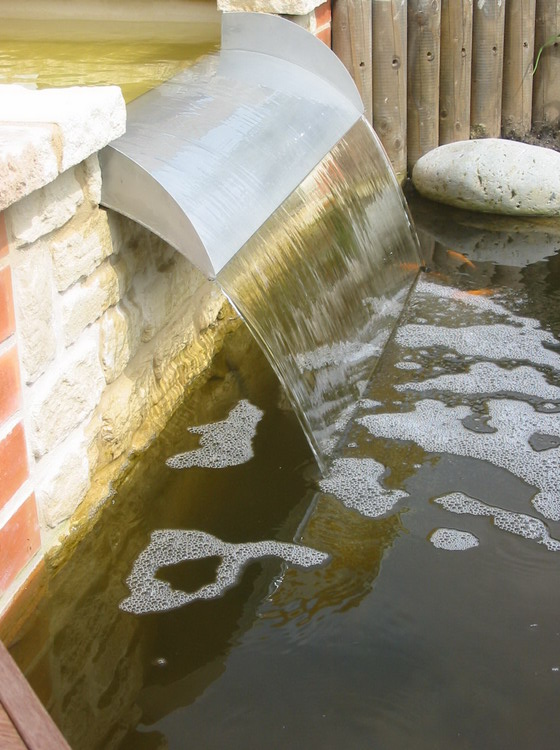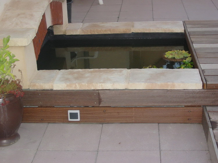 L’esthétique de la voûte est certainement discutable, et j’avais imaginé que cette voûte symboliserait la sortie d’une rivière qui traverse la maison comme on peut le voir pour les moulins. Le résultat est tout autre et la sobriété ou la pureté d’un rectangle aurait été certainement mieux. D’autre part le nettoyage quotidien du filtre est fastidieux, un filtre bidon aurait été plus efficace. Un an après je pense remplacer ma pompe de bassin avec une prise supplémentaire qui prendra le skimmer. Le canal sera donc alimenté sans passer par le skimmer.