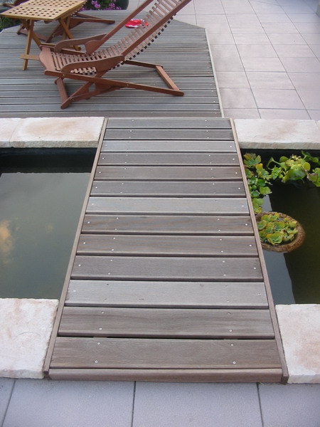 La pompe fait 15 000 l /h certainement trop puissante. Tous les tuyaux sont cachés sous le pont ou dans les habillages de rives.