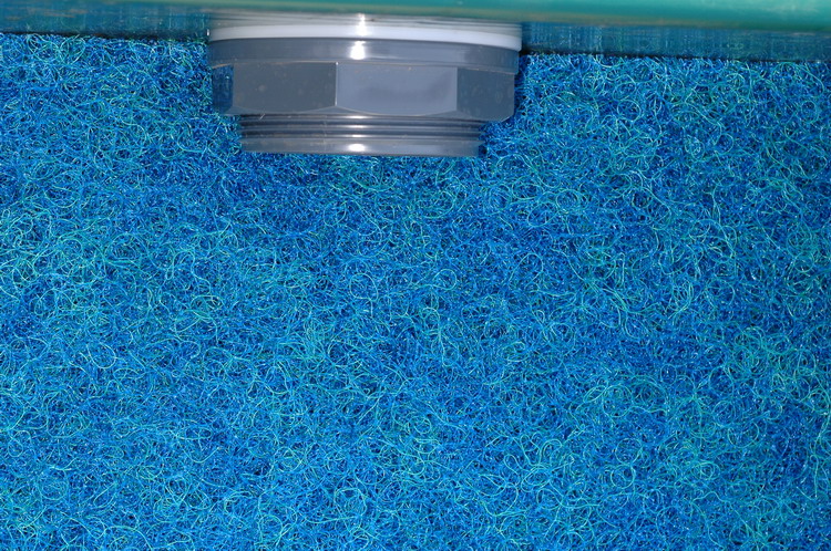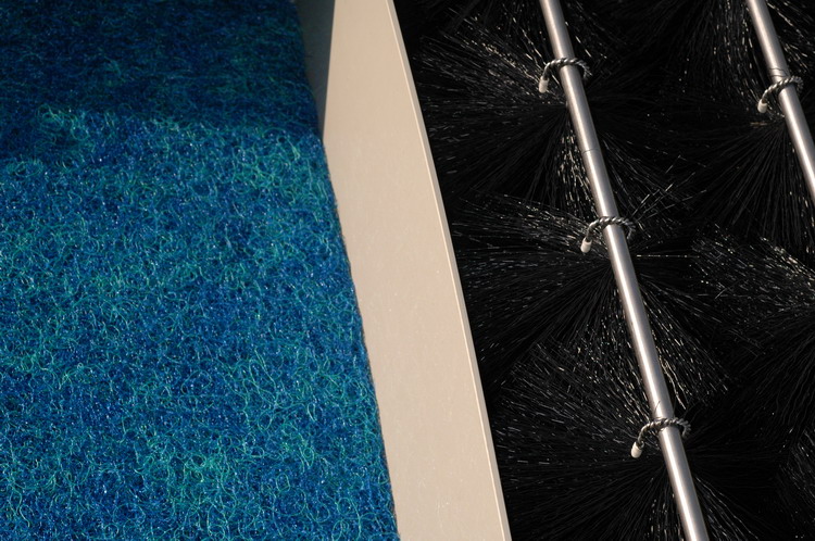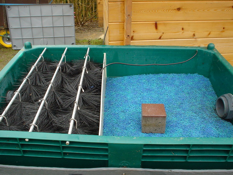 L’eau du bassin y pénètre par le dessus, traverse un compartiment rempli de brosses, passe en dessous de la plaque de séparation et remonte au travers d’un compartiment remplis de tapis japonais.