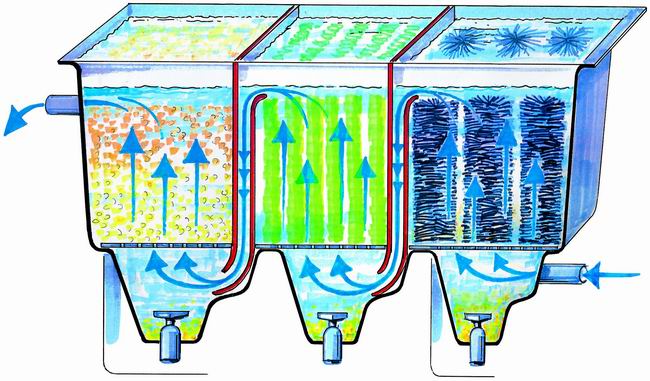 Le système est basé sur le principe de <<upflow>>. L'eau est dirigée d'abord dans les chambres de décantation, ici les premiers déchets sont accumulés. Ensuite l'eau passe au travers des masses filtrantes et puis dans la chambre de décantation suivante.