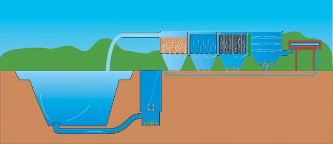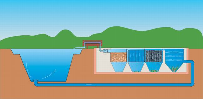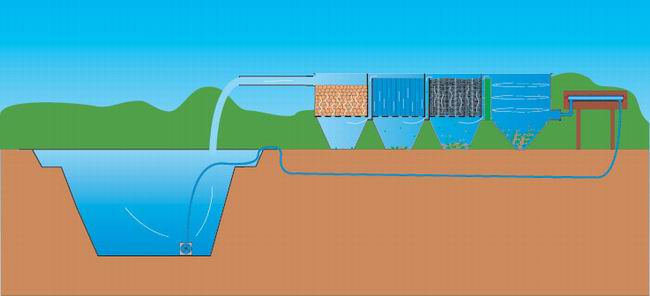 Le filtre gravitaire est aménagé au même niveau que le bassin, il