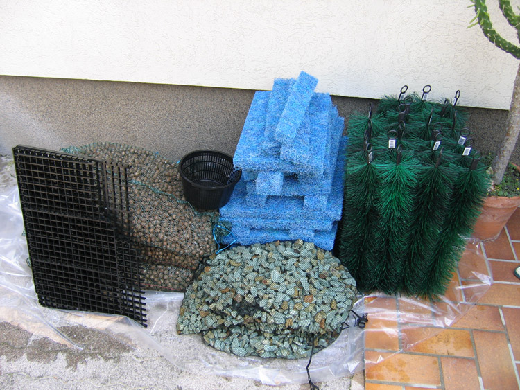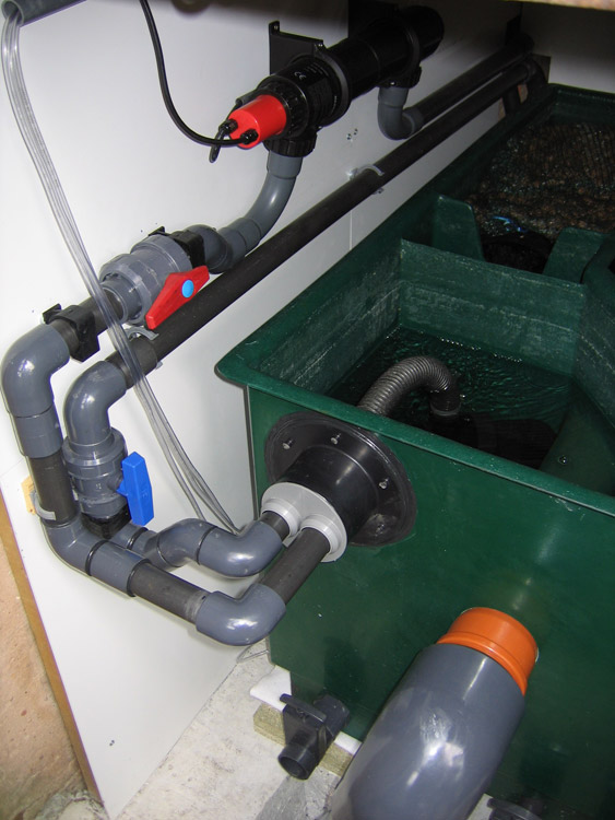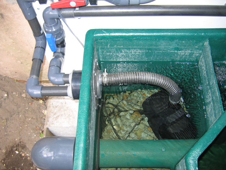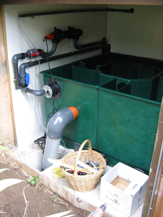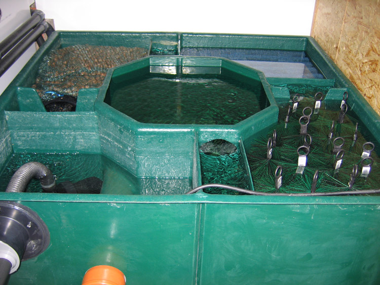 La filtration est composée d’un filtre à gravité, une pompe Messmer 8000 l/h et une lampe UV Messmer 50W ainsi qu’une pompe à air Hiblow 80