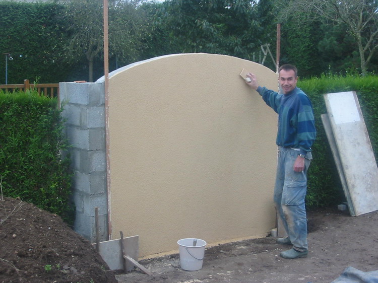 L’enduit a été réalisé en deux passes la première avec un enduit au ciment gris de 1 cm d’épaisseur, puis un enduit de finition gratté à la taloche à clou.
