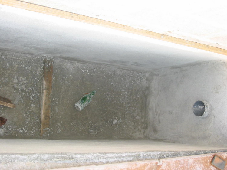 Les 3 fonds de forme ont été réalisés avec un mortier en forme de pente vers les back-wash sans oublier la réservation des 2 plaques qui formeront les séparatifs puis un enduit ciment avec hydrofuge de marque Sika recouvre le fond et les murs.